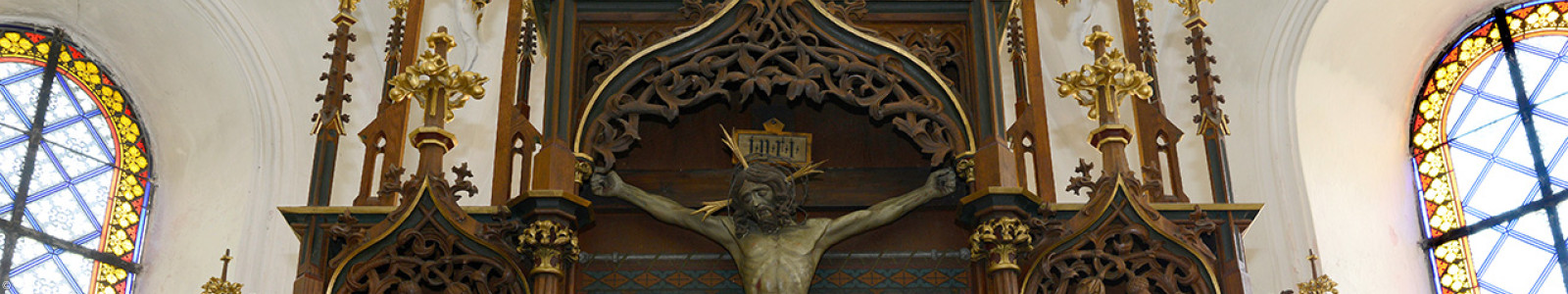 Die farbigen Fenster im Chorraum wurden 1874 von Gemeindegliedern gestiftet und im sog. Tapetenmuster gesetzt. In den vorderen Fenstern des Kirchenschiffs sind die vier Evangelisten dargestellt.